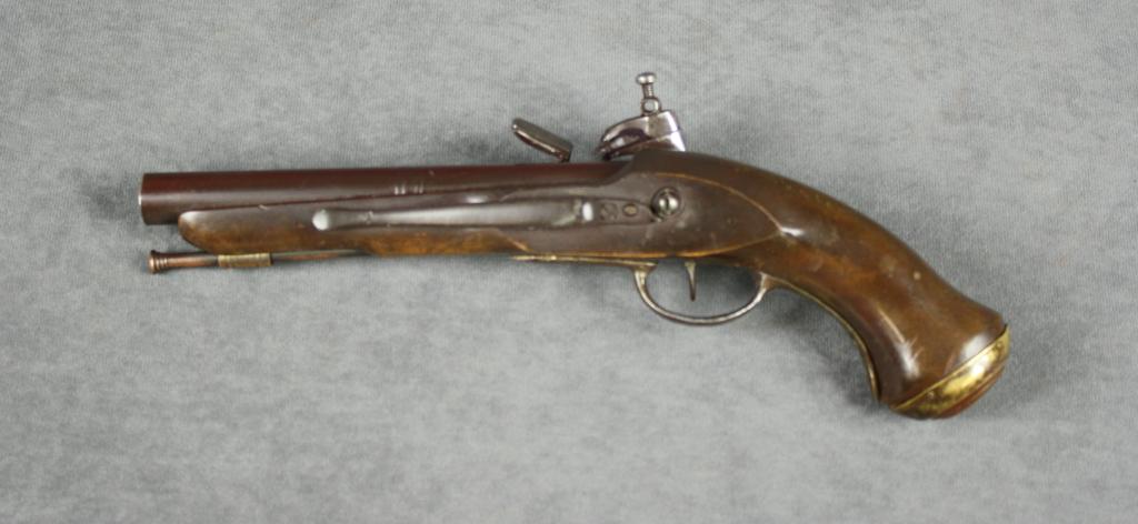 Migulete-style single shot pistol approx. 13” overall, crude lock that needs work, aged wood stock, nice display piece. Est.: $150-$300.