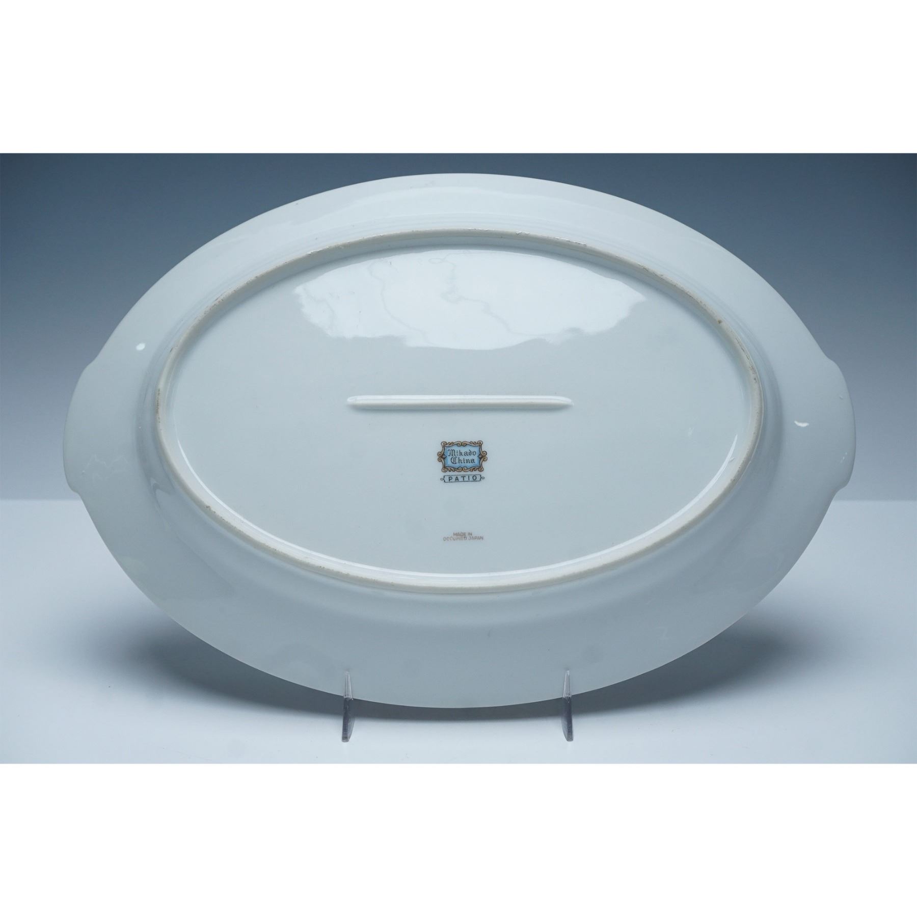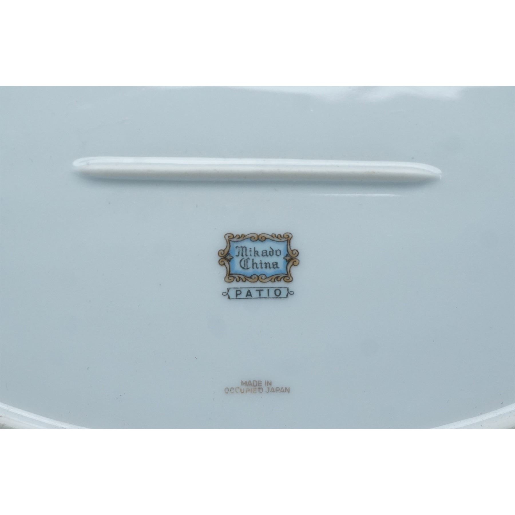 A beautifully hand-painted Mikado China serving platter in the Patio pattern, marked "Made in Occupied Japan." This elegant oval porcelain platter features a delicate floral design with pink, yellow, and orange flowers, accented by green foliage along the rim. The central floral motif is framed by gold gilt detailing, and the platter is finished with ornate gold handles. Produced during the post-World War II Occupied Japan era (1945-1952), this piece reflects the fine craftsmanship of Japanese porcelain makers during this period.