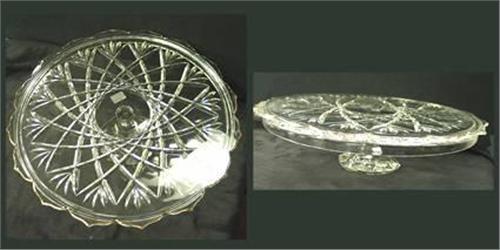 Mikasa crystal Lotus cake plate with gold accents. Measures 14" across the top and stands 4" tall. With original Mikasa label, no chips or cracks