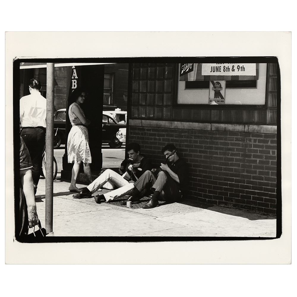 Original 10 x 8 silver gelatin photograph of Mike Bloomfield and his friend Roy Ruby busking on the sidewalk outside a Chicago liquor store at the corner of North and Wells in 1963, taken by Raeburn Flerlage. Reverse bears a "Raeburn Flerlage / ASMP" credit stamp and numerical annotations. In fine condition, with a mild horizontal bend. Raeburn Flerlage (1915-2002) was a photographer known for capturing the blues and folk scenes in 1960s Chicago, documenting the likes of Howlin’ Wolf, Muddy Waters, John Lee Hooker, Odetta, John Coltrane, and Bob Dylan.