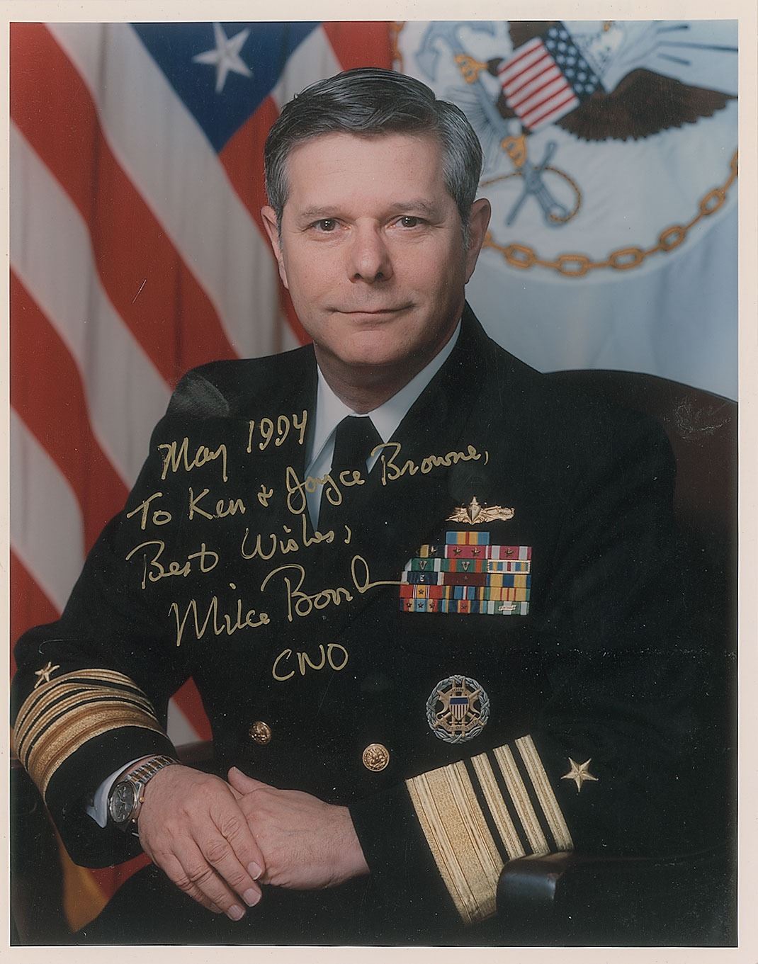 United States Navy admiral (1939–1996) who served as the 25th Chief of Naval Operations, and committed suicide following a media investigation into the legitimacy of his having worn two service ribbons with bronze 'V' devices, which indicate the awards were for service in a combat zone. Boorda had not participated in combat, and the error is believed to have been made in good faith. Nevertheless, Boorda felt as though he had tarnished the reputation of the Navy and took his own life. Color satin-finish 8 x 10 photo of Boorda in uniform with the incorrect 'V' devices on his ribbon rack, signed and inscribed in gold ink "May 1994, To Ken & Joyce Browne, Best Wishes, Mike Boorda, CNO.” In fine condition, with a couple of light scuffs to the photo.