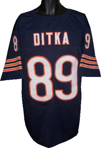 Mike Ditka led the Bears to six NFC Central titles and three trips to the NFC Championship Game. Ditka's coaching career hit its pinnacle on January 26, 1986 with a 46-10 trouncing of the New England Patriots in Super Bowl XX at the Louisiana Superdome in New Orleans, Louisiana. He was awarded NFL Coach of the Year honors in 1985 and 1988 by the Associated Press, The Sporting News, and Pro Football Weekly. This is a Mike Ditka Chicago Bears unsigned Navy TB unlicensed custom-prostyle jersey with twill stitched nameplate and numbers. perfect for autograph or to wear! Size XL