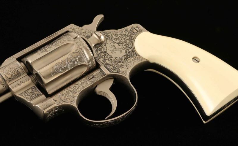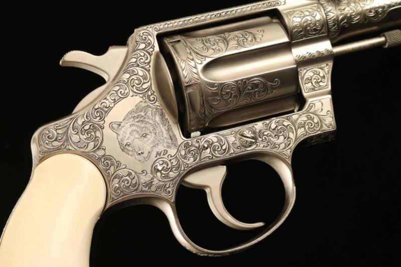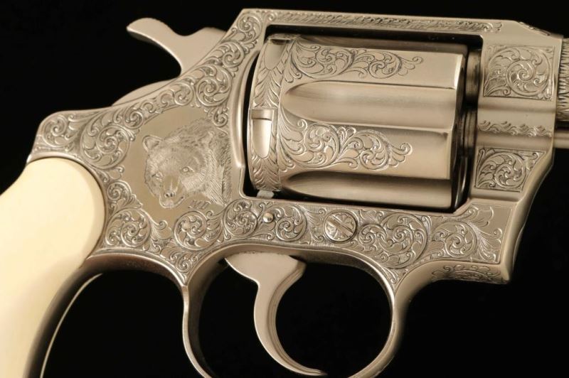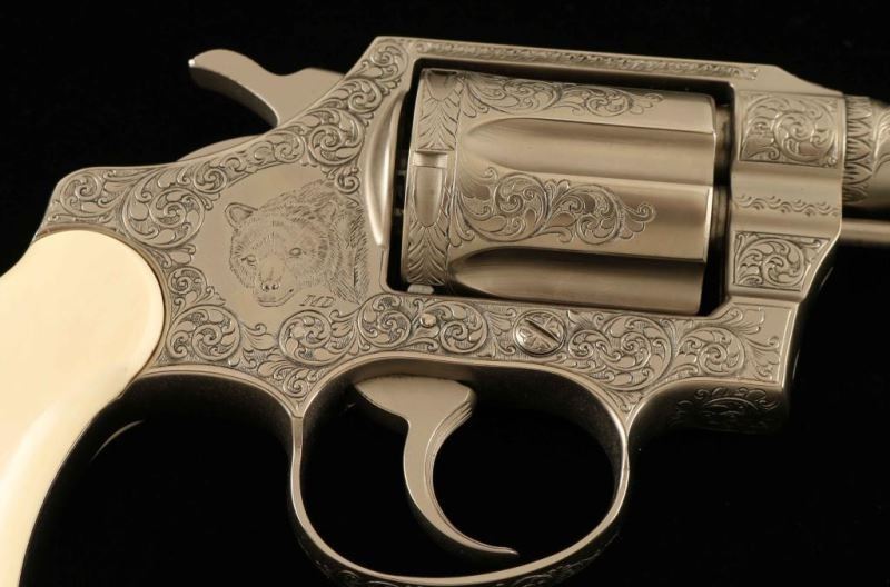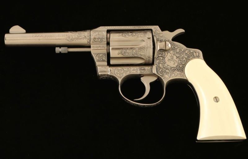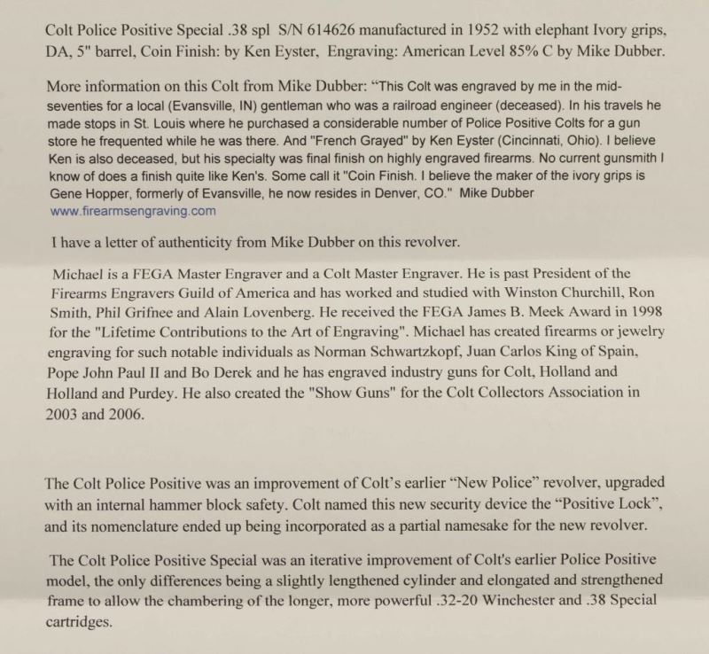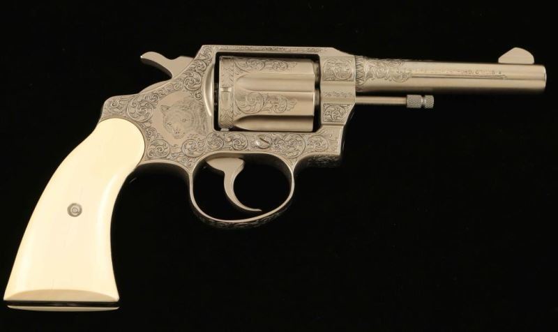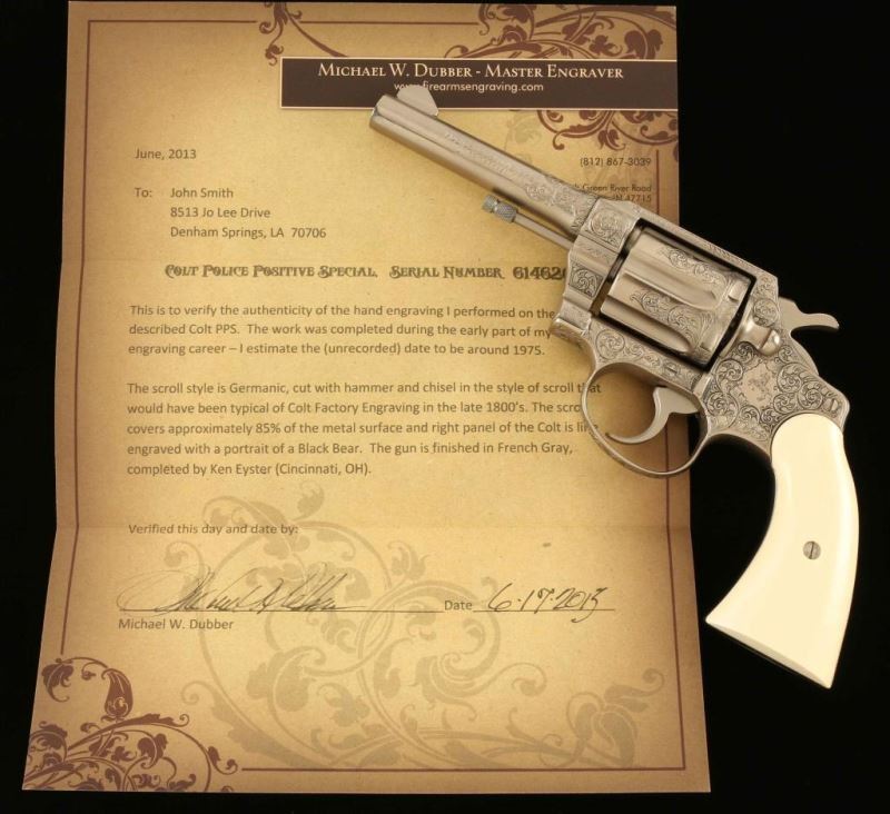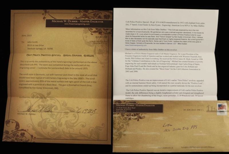 SN: 614626 Magnificently engraved & restored vintage double action revolver chambered in .38 Special, manufactured circa 1952. This revolver been meticulously embellished with 85% level coverage scroll engraving by FEGA master engraved & Colt master engraver Mike Dubber. Accompanying the revolver is a letter from Mike Dubber authenticating his work and attributing the time or engraving to be around 1975. Features a French Gray finish completed by Key Eyster, deluxe Germanic scroll engraving in the style of 1800's Colt Factory Engraving with a portrait of a Black Bear on the right panel along with Mike Dubber's initials, 4" barrel with single line address on the right side, forged blade front sight, square notched rear sight, non-shrouded ejector, serrated trigger, serrated hammer spur, fluted six-shot cylinder, and two-piece ivory grips. Revolver exhibits nearly all of it's French grey finish showing no visible losses but some bright wear on the left side of the barrel. Action performs well, the engraving is crisp, markings are sharp, the bore is excellent and the ivory grips are fine. Condition is NRA Excellent as restored. ***C&R Firearm***
