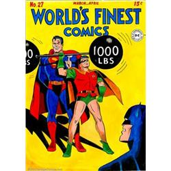 Mike Esposito and Stan Goldberg - Original Cover Recreation for World's Finest #27 (undated). A classic cover, re-rendered in all its Golden Age glory. A specialty piece, this beautiful recreation measures approximately 24" x 15.75", with an image area of approximately 21.25" x 15", and is in excellent condition. A stunning display piece perfect for any collection. Important notice: We expect to be auctioning lots at the rate of 200-250 per hour. Sometimes eBay Premier live bid software cannot keep up with that pace, so we strongly recommend that you place a realistic proxy bid now as insurance to avoid disappointment. Also please note that all Heritage/CAA lots purchased through eBay Premier carry a 20% Buyer's Premium. Please make sure you read the Terms and Conditions.