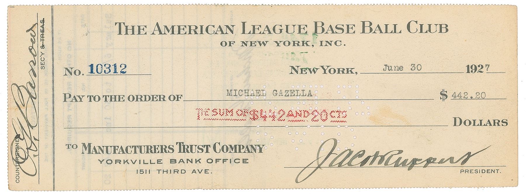 The American League Base Ball Club of New York check, 9 x 3.25, filled out in type and signed by Ruppert, "Jacob Ruppert," and vertically countersigned by Barrow, "E. G. Barrow," payable to Michael Gazella for $442.20, June 30, 1927. Endorsed on the reverse in black ink, "Michael Gazella." In fine condition. A desirable thrice-signed check featuring the Yankees owner, general manager, and fan favorite utility infielder.