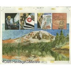 <B>Mike Grell - Green Arrow: The Longbow Hunters Book Three: Tracking Snow, pages 20 and 21 - Original Art (DC, 1987).</B></I> Green Arrow journeys to Mt. Rainier where he will face a final confrontation with Japanese assassin Shado, the C.I.A. and a drug cartel, in this third book of the landmark <B>Green Arrow: The Longbow Hunters</B></I> series published in 1987. Storyteller and artist, Mike Grell, has always had a strong love for the character, and would take the over reigns of Green Arrow's career for the next seven years. The artwork in this prestige format series was regarded by most as absolutely spectacular. Grell painted the covers and provided the pencils within the interiors, while artist Lurene Haines assisted with some of the drawing, inking, and color work. This intriguing double page spread features Green Arrow and a spectacular view of Mt. Rainier... not to be missed! The image area measures 16.5" x 23" and is in Excellent condition. The Rainier image at the bottom has been cut and added over the four frames at the top. Signed by Mike Grell and Lurene Haines. It's a piece of fine art suitable for framing!
