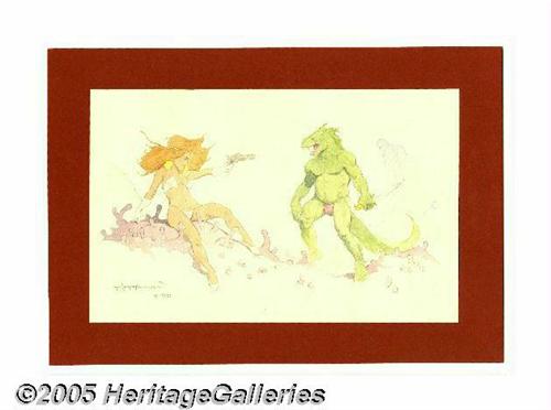 <B>Mike Hoffman - Beauty and the Lizardman Illustration Original Art (1998).</B></I> Mike Hoffman's fantasy artwork is treasured by modern era collectors. The eroticism of this delicately watercolored scene is eerie and remarkable. Painted on a 11" x 7" sheet of paper, the art is in Excellent condition, and Hoffman has signed it at the lower left.
