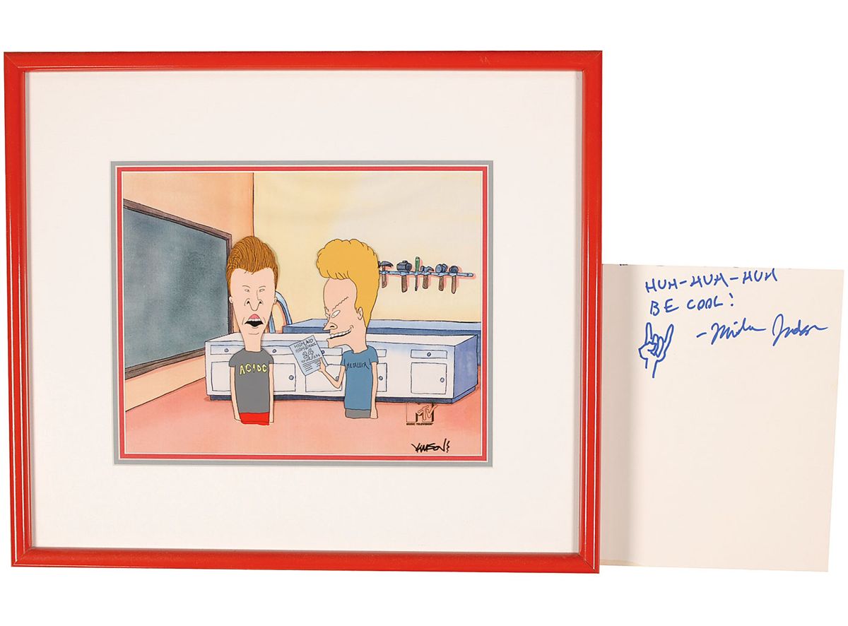 Original felt tip sketch of a hand making ‘devil horns,’ on an off-white 8 x 10 sheet of cardstock, signed “Huh-Huh-Huh, Be cool! Mike Judge”; and an original hand-painted Beavis and Butthead animation cel, 11.5 x 9.25, showing the pair in shop class, and set against a pre-printed background, signed in black felt tip by a Beavis and Butthead animator. Triple matted and framed to an overall size of 19.5 x 17. In fine condition. Accompanied by a 1994 affidavit of authenticity from Blake Levine attesting to the Judge signature.