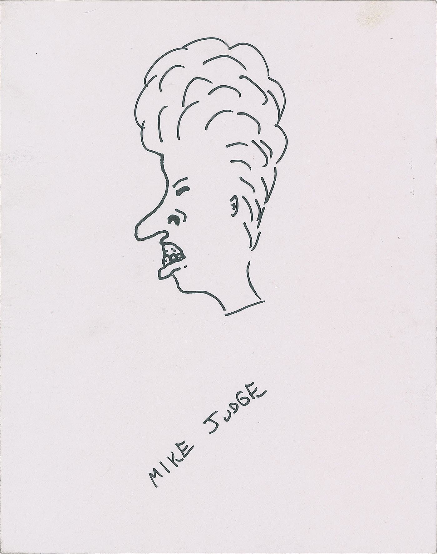 Original felt tip sketch by Mike Judge on a white 11 x 14 cardstock sheet, which shows Butt-Head, of Beavis and Butt-Head animated fame, in a noble profile pose similar to the show's opening credits, signed below by Judge. In fine condition.