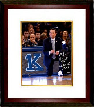 Mike Krzyzewski has served as the head men's basketball coach at Duke University since 1980. At Duke, Krzyzewski has led the Blue Devils to four NCAA Championships, 12 Final Fours, 12 ACC regular season titles, and 13 ACC Tournament championships. On November 15, 2011, Krzyzewski led Duke to a 74–69 victory over Michigan State at Madison Square Garden to become the coach with the most wins in NCAA Division I men's basketball history. Krzyzewski's 903rd victory set a new record, breaking that held by his former coach, Bob Knight. On January 25, 2015, Duke defeated St. John's, 77–68, again at Madison Square Garden, as Krzyzewski became the first Division I men's basketball coach to reach 1000 wins. Mike Krzyzewski has hand signed this Duke Blue Devils 1000th Win 16x20 Photo with "1000th Win 1-25-15". Steiner Sports Hologram and Certificate of Authenticity. Custom White Mat and Premium Mahogany Frame as shown.