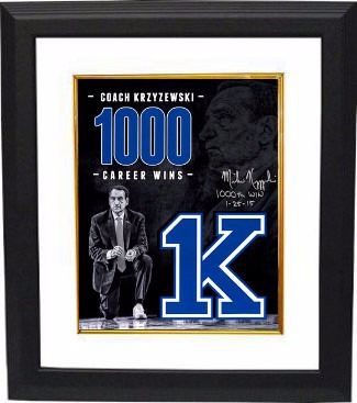 Mike Krzyzewski has served as the head men's basketball coach at Duke University since 1980. At Duke, Krzyzewski has led the Blue Devils to four NCAA Championships, 12 Final Fours, 12 ACC regular season titles, and 13 ACC Tournament championships. On November 15, 2011, Krzyzewski led Duke to a 74–69 victory over Michigan State at Madison Square Garden to become the coach with the most wins in NCAA Division I men's basketball history. Krzyzewski's 903rd victory set a new record, breaking that held by his former coach, Bob Knight. On January 25, 2015, Duke defeated St. John's, 77–68, again at Madison Square Garden, as Krzyzewski became the first Division I men's basketball coach to reach 1000 wins. Mike Krzyzewski has hand signed this Duke Blue Devils Tribute 16x20 Photo with "1000th Win 1-25-15". Steiner Sports Hologram and Certificate of Authenticity. Custom White Mat and Premium Black Frame as shown.