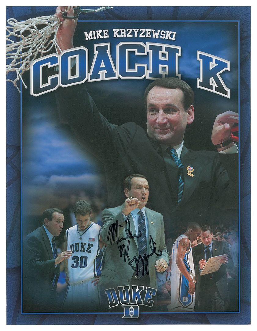 Three color cardstock composite photos, one 8 x 10 and two 8.5 x 11, each featuring Krzyzewski’s stats on the back, each signed in black felt tip by Krzyzewski. In fine condition.