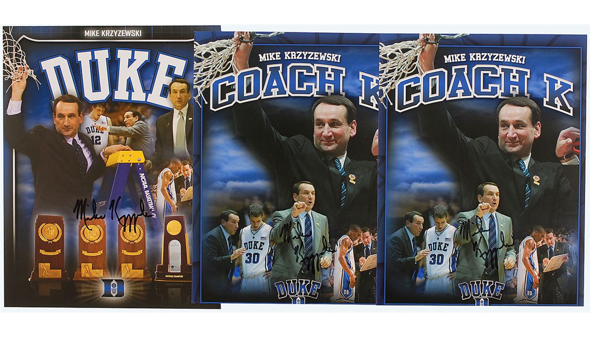 Three composite color cardstock photos of Krzyzewski at Duke, two 8 x 10 and one 8.5 x 11, each signed in black felt tip. In fine condition.
