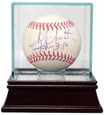 Mike Matheny is the current manager of the St. Louis Cardinals of Major League Baseball (MLB), a position he has held since 2012. He made his MLB debut for the Brewers in 1994 and retired in 2006 with the San Francisco Giants. He also played for the Toronto Blue Jays and Cardinals during his thirteen-year catching career.Mike Matheny has hand signed this 2016 Spring Training Used Official Major League Baseball w/ 2016 Florida Logo with John 3:16 inscription. Note: Ball is used and discolored. Certificate of Authenticity from Athlon Sports Collectibles. Back side of ball shown in corner. Glass display case included.