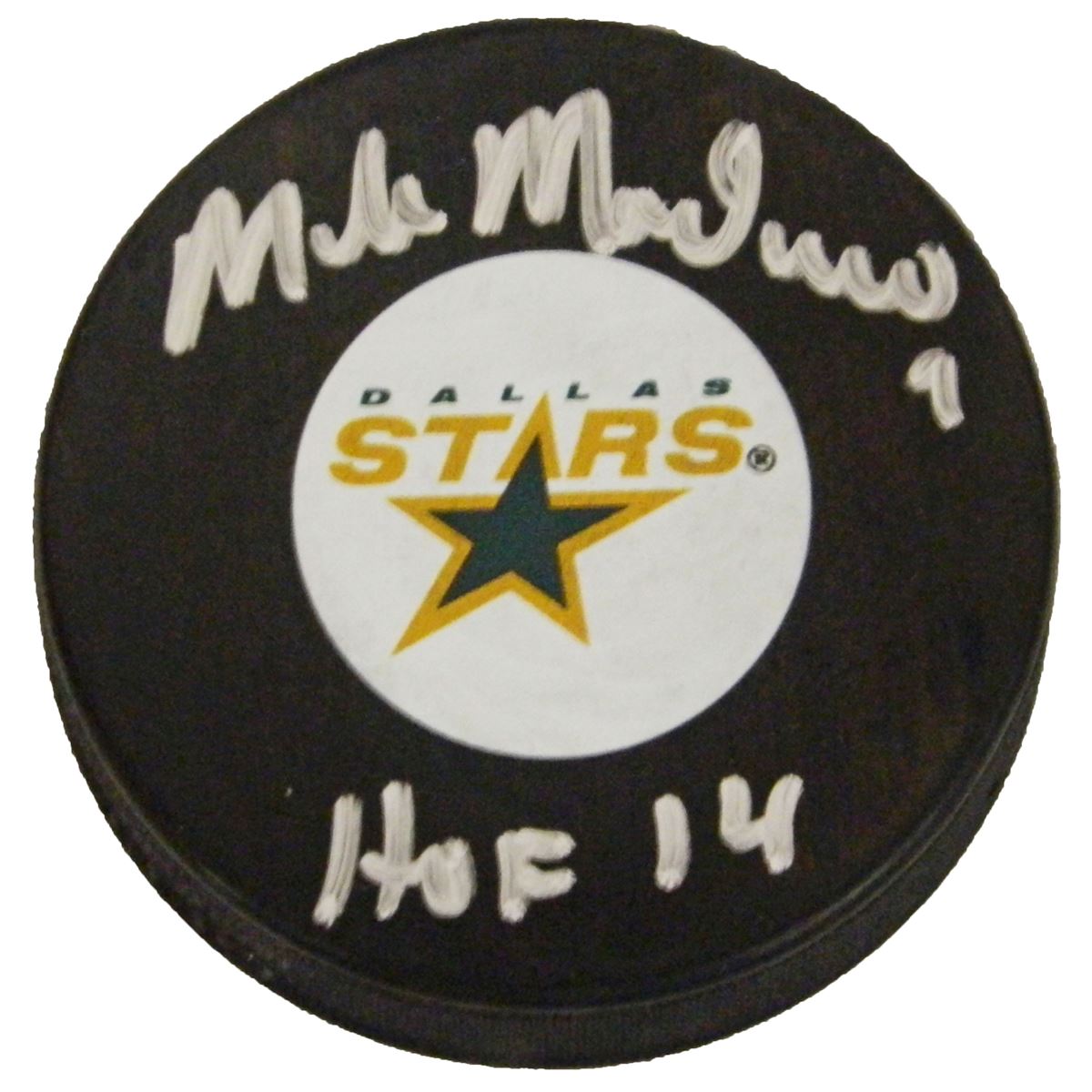 Mike Modano signed Dallas Stars NHL logo hockey puck with 'HOF 14' inscription. Item comes with a Schwartz Sports Memorabilia tamper-proof numbered hologram and Certificate of Authenticity which can be verified online.