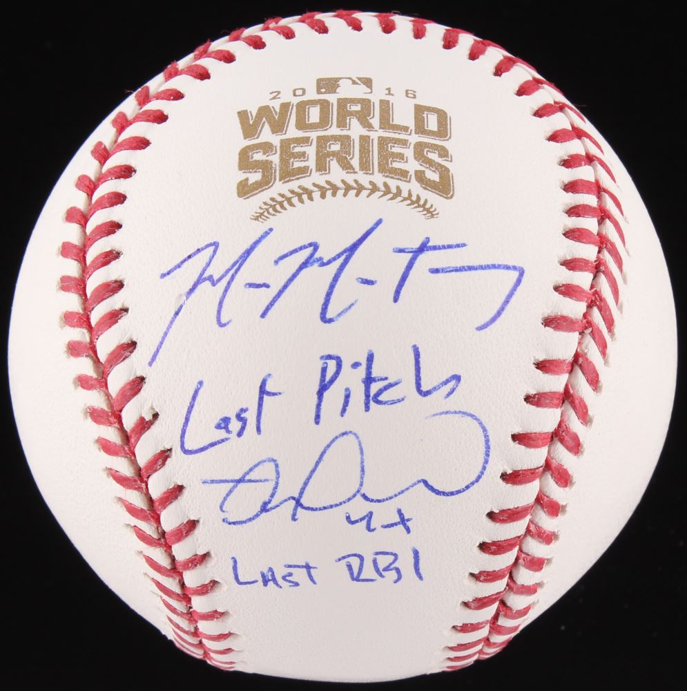 Rawlings Official 2016 World Series Baseball. Hand-signed and inscribed in blue ink pen by Mike Montgomery and Miguel Montero. (Cubs)