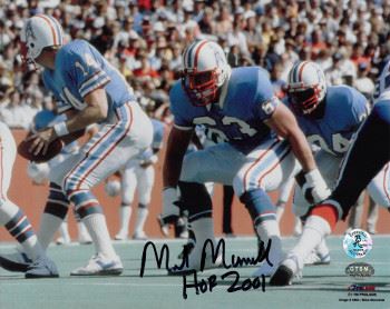 Mike Munchak played for the Houston Oilers of the NFL. Munchak was inducted into the Pro Football Hall of Fame in 2001. He teamed up with Bruce Matthews to have one of the greatest offensive line tandems in NFL history. Mike Munchak has hand autographed this Houston Oilers 8x10 Photo with HOF 2001 Inscription. Certificate of Authenticity from Athlon Sports Collectibles.