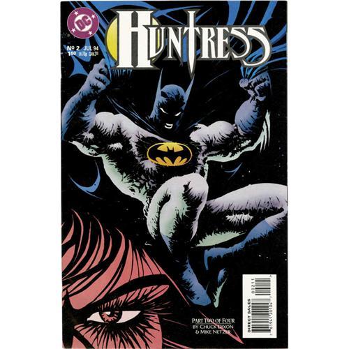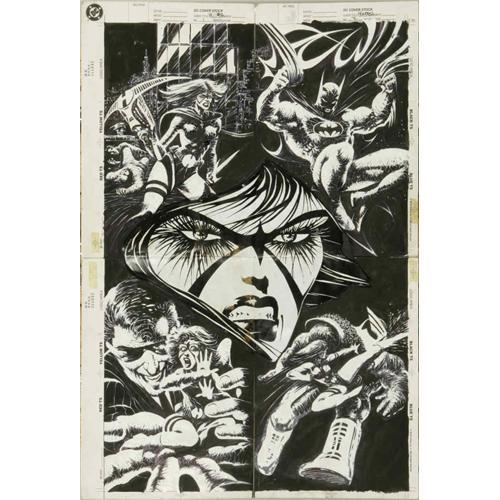 <B>Mike Netzer - Huntress #1-4 Cover Original Art (DC, 1994).</B></I> This spectacular showpiece features all four of Mike Netzer's covers for the <B>Huntress</B></I> mini-series. These four covers join together to form a striking Bat-montage, with a large portrait of the Huntress spotlighted in the center. The portrait image is a large photostat. Each cover has an individual image area of 9.75" x 15", and a combined image area of 19.5" x 30". These four covers were taped together on the back of the paper, and along the borders on the front; otherwise the art is in Very Good condition.