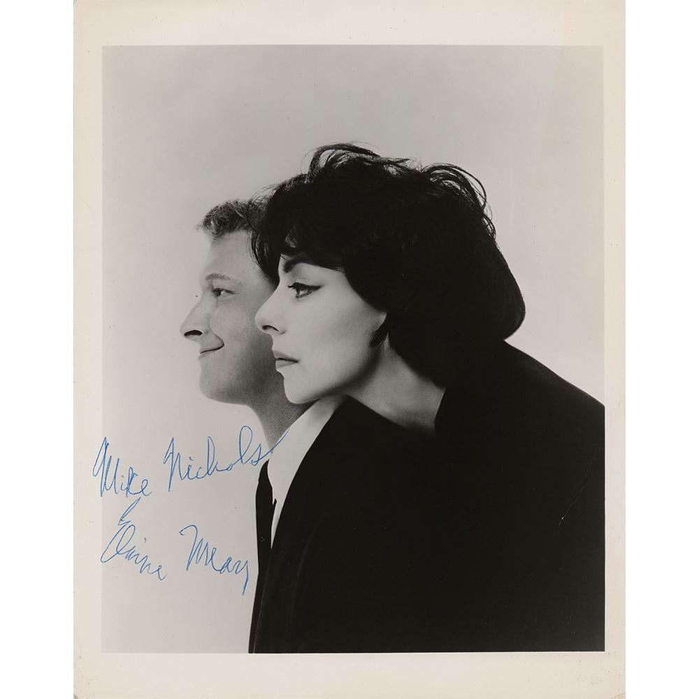 Vintage glossy 8 x 10 photo of legendary comedy duo Nichols and May in profile, signed in blue ballpoint by Mike Nichols and Elaine May. In very good to fine condition, with some scattered creasing. Consignor notes that the signatures were obtained in person in Scottsdale, Arizona, in 1996.