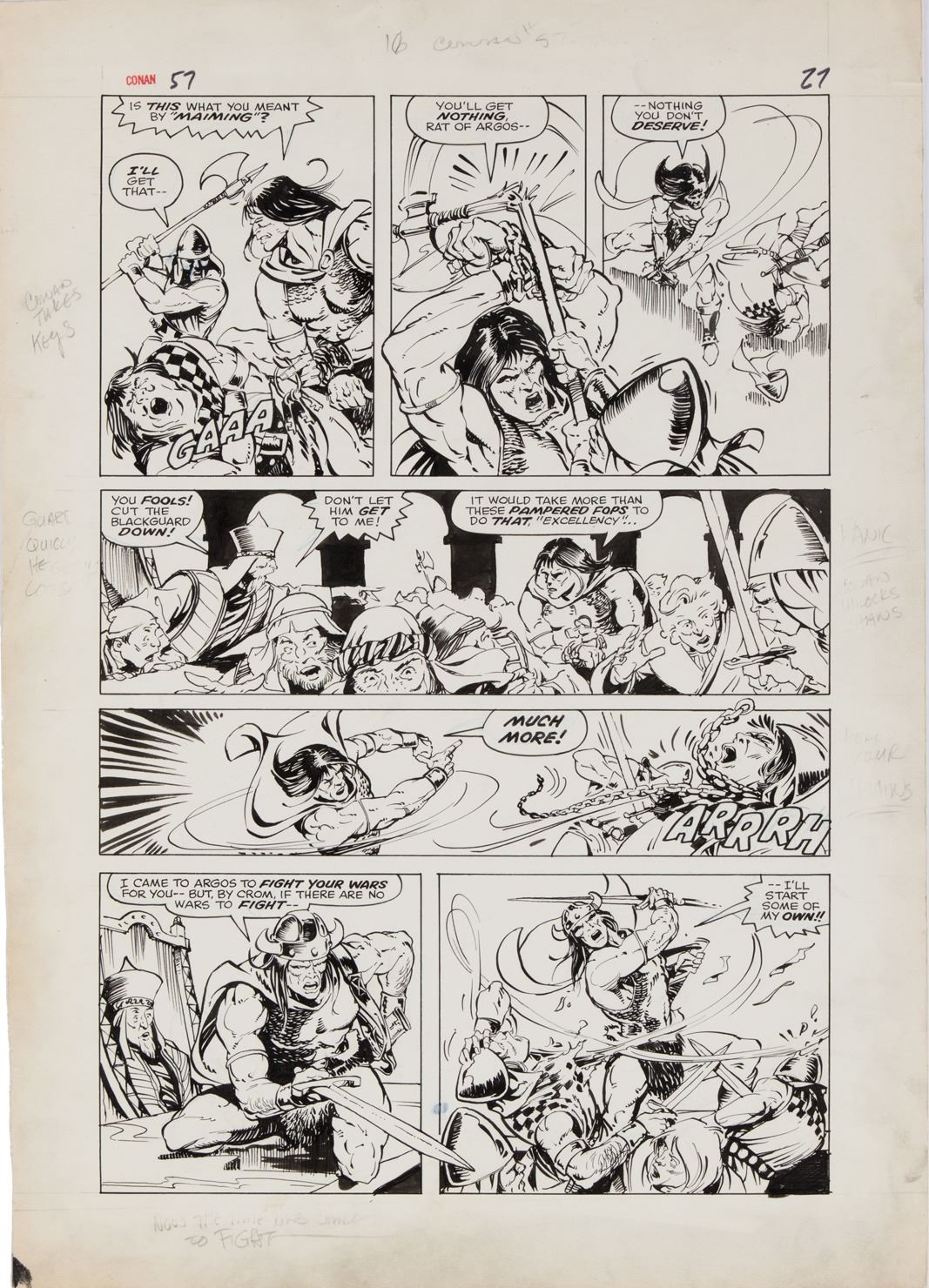78. Mike Ploog artwork for a page from Conan the Barbarian #57. (Marvel, 1975) Accomplished in pencil and ink on 14.5 x 20.5 in. oversize comic art stock. This particular issue of Conan the Barbarian was a special fill-in issue both penciled and inked by one of Marvel's most popular fan-favorite artists. Mike Ploog was surely at the top of his career in the mid-1970s as seen in this stunning battle page showing "Conan" freeing himself from his captors, and the art is oversized to boot! Production notes in margins and slight border wear. Otherwise, in very good condition. $1,000 - $2,000