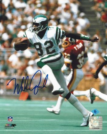 Mike Quick was a surprise 1st round pick by the Eagles in the 1982 NFL Draft. He developed into a five-time Pro Bowler, having been selected consecutively from 1983 to 1987. He led the NFL in receiving yards in 1983 with 1,409 and finished second in 1985 with a total of 1,247. On November 10, 1985, Mike Quick caught a 99-yard touchdown pass from Ron Jaworski in overtime (an Eagles team record, and tied with eleven other QB-WR combos as an NFL record), as the Eagles beat the Atlanta Falcons in the game. In 1987, the Eagles Honor Roll was established and Mike Quick was inducted in 1995. Mike Quick has hand signed this Philadelphia Eagles 8x10 Photo. Certificate of Authenticity from Athlon Sports Collectibles.