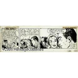 <B>Mike Roy - The Saint Daily Comic Strip Original Art, dated 5-27-50 (New York Herald Tribune, 1950).</B></I> "Wherever a mouse knows there's a trap - he has a chance of stealing some cheese!" Suave sleuth Simon Templar's advice kicks off this <I>The Saint</B></I> daily comic strip adventure, by writer Leslie Charteris and artist Mike Roy. There's a Templar in every panel of this charismatic daily dated 5-27-50. The art measures 22" x 7.5" with an image area of 21" x 5.75". The art has some slight paste-up residue staining along the edges, outside of the image area, otherwise it is in Excellent condition.