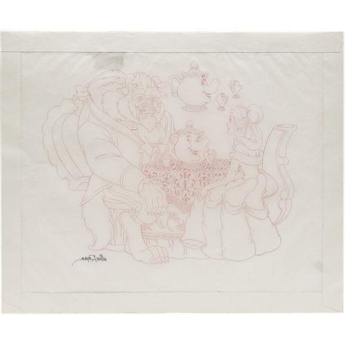 <B>Mike Royer - "Beauty and the Beast" Illustration Original Art (undated).</B></I> It's tea time as Mrs. Potts and Chip serve beautiful Belle and the Beast a refreshing hot beverage. Mike Royer has drawn a lighthearted rendition of some of the most beloved characters in the later Walt Disney animated film canon. This piece has an image area that measures 14.75" x 12", and is in Very Good condition with moderate overall wear.