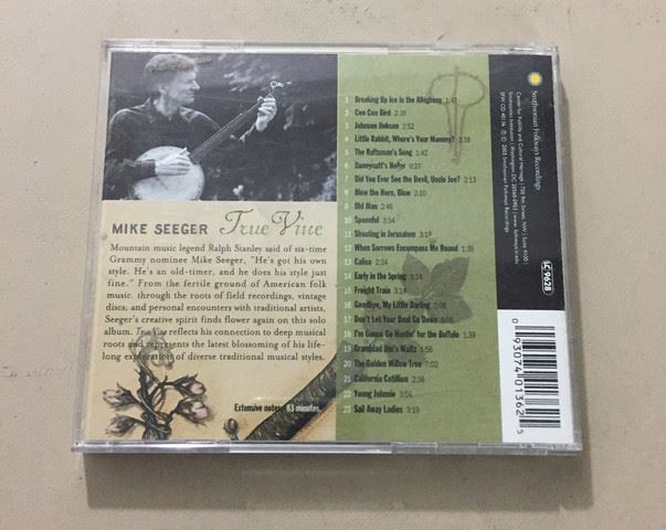 Mike Seeger's CD "True Vine", released in 2003, is autographed by the singer. Jewel case includes front cover/booklet of album information, as well as back cover with a photo of Mike Seeger and song listings.