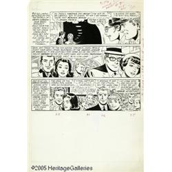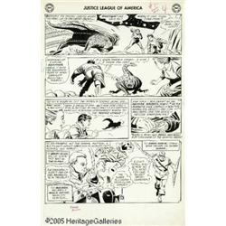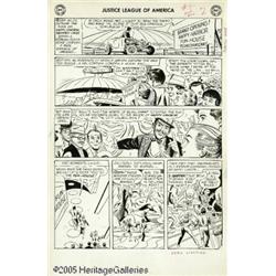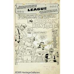 <B>Mike Sekowsky and Bernard Sachs - Justice League of America #7 Complete 25-page Story "The Cosmic Fun-House!" Original Art (DC, 1961).</B></I> Snapper Carr and his best gal Midge make the scene at the grand opening of the Happy Harbor Fun-House, but something weird is going on -- as they pass through one particular door, they are teleported across outer space to an alien planet! Obviously, this is a case for the Justice League, who infiltrate the Fun-House in their civilian identities, only to be captured by the extraterrestrials who control the secret door, a test-run for a bold invasion plan! At one point, four of the JLA-ers (Green Arrow, Wonder Woman, Flash, and Green Lantern) are morphed into bizarre distorted fun-house-mirror versions of themselves. This wacky tale is a prime example of the early years of <B>Justice League</B></I>, with its jaunty pace, alien menace, wild concepts, and the relative absence of the "big name" members of the League (Superman and Batman are largely offscreen, though they do appear in a few pages). Amazingly, the original art for the complete story of this wonky masterpiece has remained together, and is offered here in its entirety, all twenty-five action packed pages, rendered with chunky aplomb by Mike Sekowsky and Bernard Sachs. The title splash has some creasing and small tears, mostly along the top edge, and the JLA logo stat has suffered considerable damage; however, all the remaining pages are in Very Good condition, with only minor overall wear. The first sixteen pages measure 14.25" x 22.25", while the last nine are slightly smaller at 14.25" x 21"; image area on all is 13" x 18". There can't be too many complete JLA stories of this vintage floating around, so you'd be crazy not to bid. To quote Mr. Snapper Carr, "This is the living most!" 25 Coins