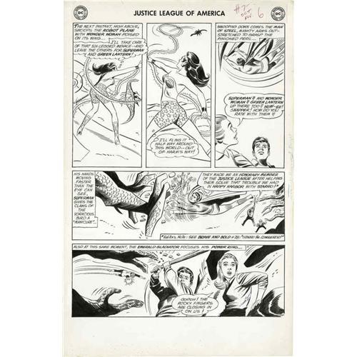 <B>Mike Sekowsky and Bernard Sachs - Justice League of America #7, page 6 Original Art (DC, 1961).</B></I> Wonder Woman struts her stuff on this superb action-packed page. Superman, Green Lantern, and Snapper Carr cameo. As if that weren't enough, the back of the page features a Sekowsky pencil sketch of -- Ziggy Pig! The page has an image area of 13" x 18", and the condition of the art is Excellent.