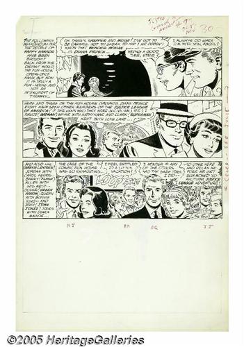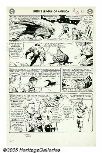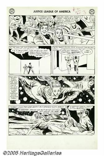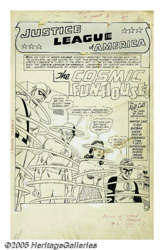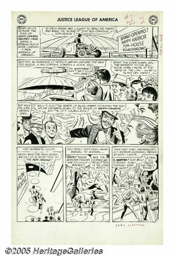 <B>Mike Sekowsky and Bernard Sachs - Justice League of America #7 Complete 25-page Story "The Cosmic Fun-House!" Original Art (DC, 1961).</B></I> Snapper Carr and his best gal Midge make the scene at the grand opening of the Happy Harbor Fun-House, but something weird is going on -- as they pass through one particular door, they are teleported across outer space to an alien planet! Obviously, this is a case for the Justice League, who infiltrate the Fun-House in their civilian identities, only to be captured by the extraterrestrials who control the secret door, a test-run for a bold invasion plan! At one point, four of the JLA-ers (Green Arrow, Wonder Woman, Flash, and Green Lantern) are morphed into bizarre distorted fun-house-mirror versions of themselves. This wacky tale is a prime example of the early years of <B>Justice League</B></I>, with its jaunty pace, alien menace, wild concepts, and the relative absence of the "big name" members of the League (Superman and Batman are largely offscreen, though they do appear in a few pages). Amazingly, the original art for the complete story of this wonky masterpiece has remained together, and is offered here in its entirety, all twenty-five action packed pages, rendered with chunky aplomb by Mike Sekowsky and Bernard Sachs. The title splash has some creasing and small tears, mostly along the top edge, and the JLA logo stat has suffered some damage; however, all the remaining pages are in Very Good condition, with only minor overall wear. The first sixteen pages measure 14.25" x 22.25", while the last nine are slightly smaller at 14.25" x 21"; image area on all is 13" x 18". There can't be too many complete JLA stories of this vintage floating around, so you'd be crazy not to bid. To quote Mr. Snapper Carr, "This is the living most!"