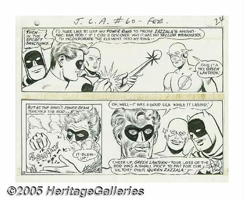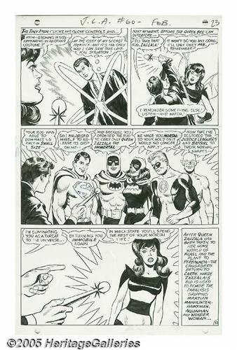 <B>Mike Sekowsky and Sid Greene - Justice League of America #60, pages 23 and 24 Original Art (DC, 1968).</B></I> The Tiny Titan, Atom, takes control of Queen Bee's magno-nuclear rod and turns the tide of the war with Queen Zazzala the Immortal, in the final two pages from "Winged Warriors of the Immortal Queen!" Superman, Batman, Batgirl, Green Lantern, and the Flash all make cameos. The image area of page twenty-three is 10" x 15," and page twenty-four is a half-page, with an image size of 10" x 7.25" (the rest of the page was left open for an ad). The panels on page twenty-four have been glued to a support paper, and the glue has left a stain between the two tiers, otherwise the pages average a Very Good condition.
