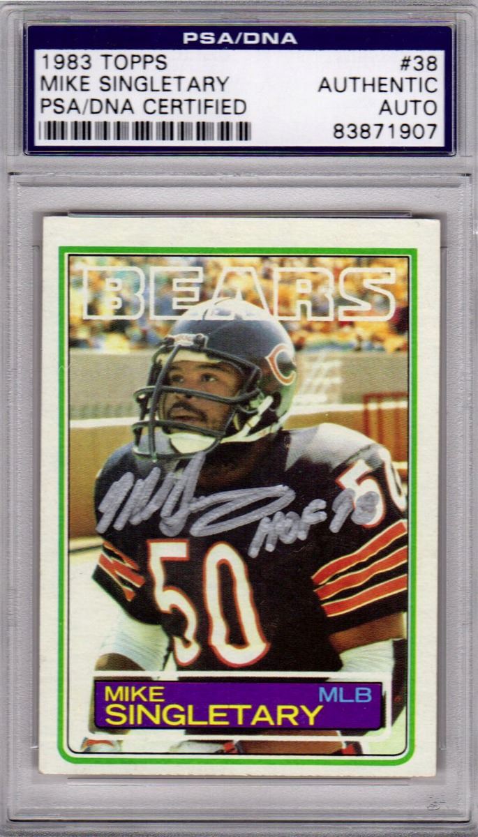 Mike Singletary signed 1983 Topps Chicago Bears rookie card #38 with 'HOF 98' inscription. The card has been authenticated and slabbed by PSA/DNA and the number can be verified online. Authenticated and autographed Rookie cards are hard to come by and are an increasingly rare and valuable collectible.