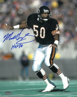 Mike Singletary spent his entire playing career as a linebacker for the Chicago Bears after starring in college at Baylor University. After playing with the Baylor Bears, Singletary was drafted by the Chicago Bears in the 2nd round of the 1981 NFL Draft and was known as "The Heart of the Defense" for the Chicago Bears' Monsters of the Midway in the mid-1980s. His nickname was Samurai Mike. He was inducted into the Pro Football Hall of Fame in 1998. Mike Singletary has hand autographed this Chicago Bears 8X10 Photo with HOF 98 inscription. Schwartz Sports Hologram and Certificate of Authenticity from Athlon Sports.