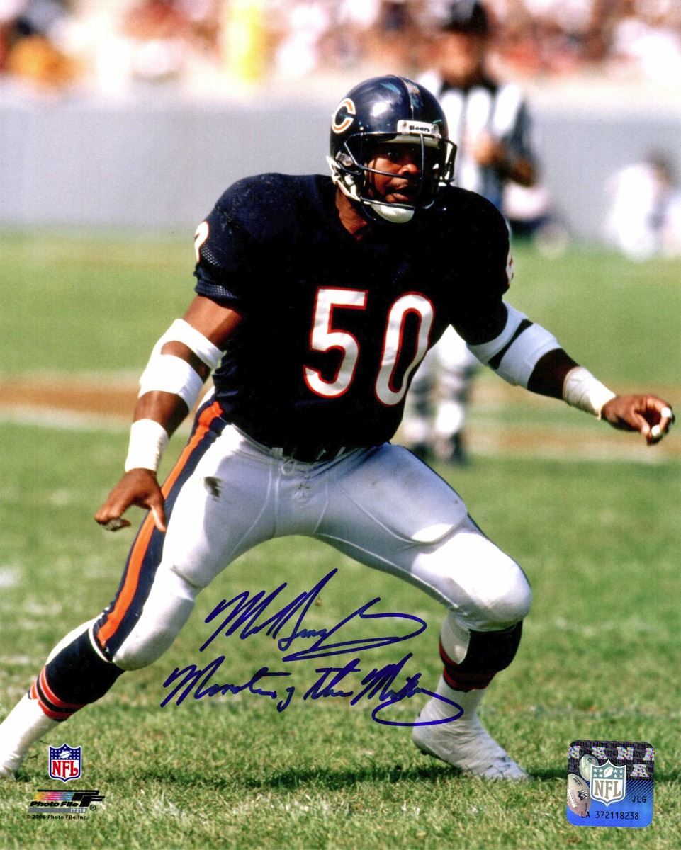 Mike Singletary signed Chicago Bears action 8x10 photo with 'Monsters of the Midway' inscription. Item comes with a Schwartz Sports Memorabilia tamper-proof numbered hologram and Certificate of Authenticity which can be verified online.