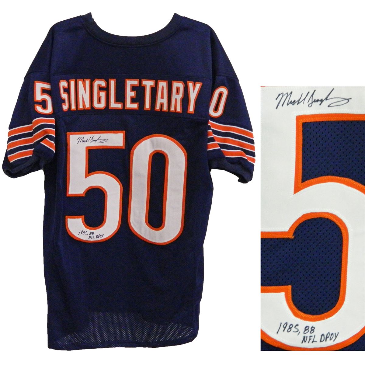 Mike Singletary signed navy custom throwback jersey with '1985, 88 NFL DPOY' inscription. Item contains the full Michael Singletary signature and comes with a Schwartz Sports Memorabilia tamper-proof numbered hologram and Certificate of Authenticity whic