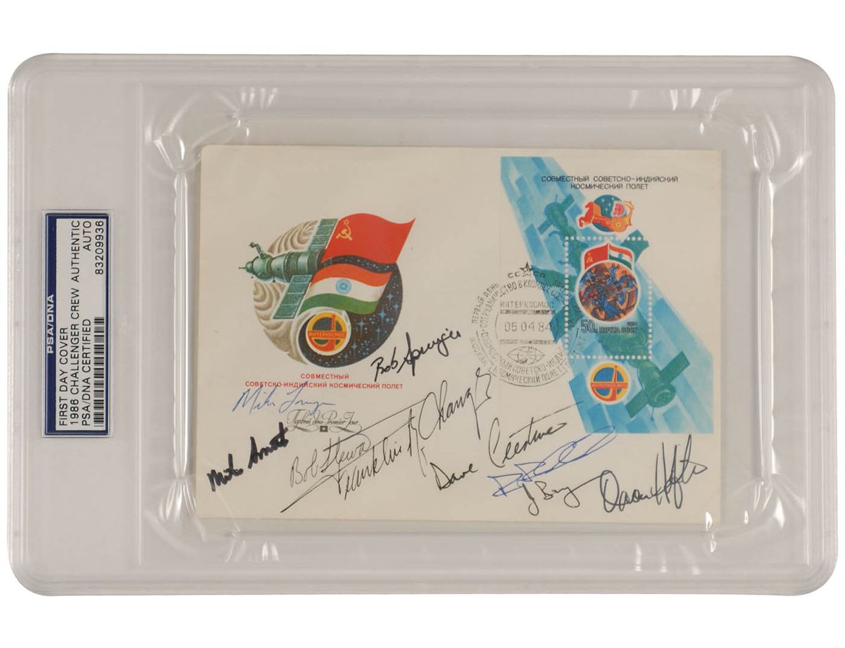Commemorative cover with a cachet honoring a Russian space mission, signed in ink and felt tip by nine astronauts, including Mike Smith, Bob Springer, Franklin Chang Diaz, and Mike Lounge. Encapsulated in a plastic PSA/DNA authentication holder. In fine condition, with light haloing to one signature.