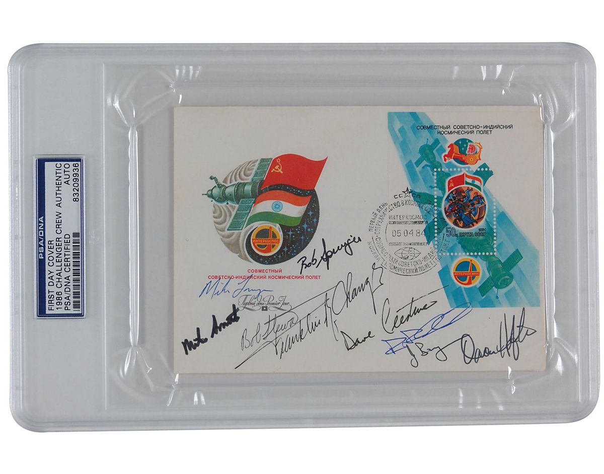 Commemorative cover with a cachet honoring a Russian space mission, signed in ink and felt tip by nine astronauts, including Mike Smith, Bob Springer, Franklin Chang Diaz, and Mike Lounge. Encapsulated in a plastic PSA/DNA authentication holder. In fine condition, with light haloing to one signature.