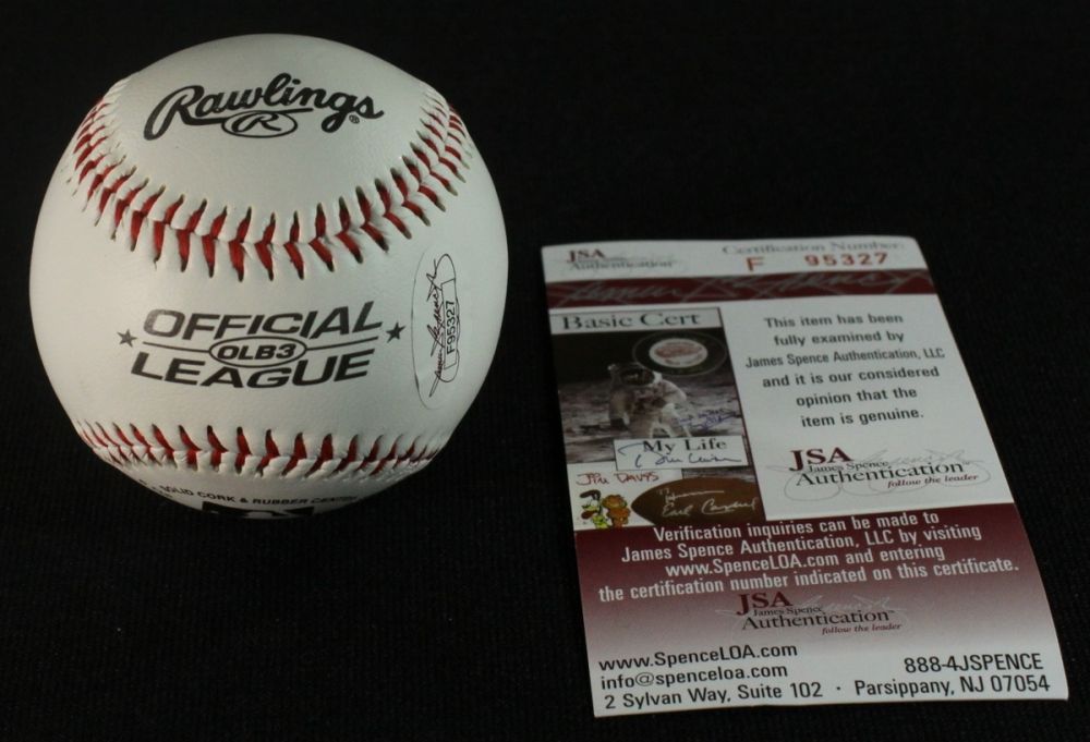 Official League Baseball hand-signed in blue ink by Mike Trout (Angels). The autograph includes an official James Spence Authentication (JSA) hologram and matching COA for authenticity purposes.