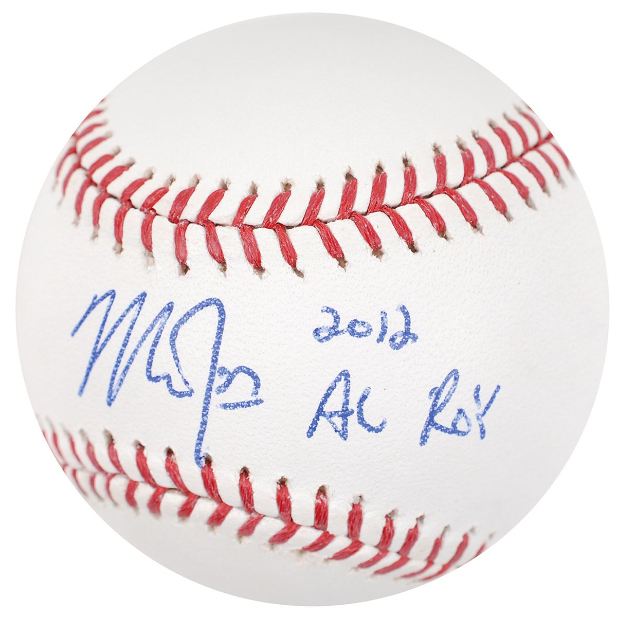 Official Rawlings Major League baseball signed in blue ballpoint on the sweet spot, “Mike Trout, 2012 AL ROY.” In fine condition, with a trivial stray ink mark, and an MLB authentication label affixed to a side panel.