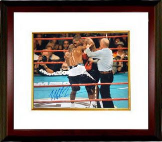 Mike Tyson is a former undisputed heavyweight champion of the world and holds the record as the youngest boxer to win the WBC, WBA and IBF heavyweight titles. Tyson won his first 19 professional bouts by knockout, 12 of them in the first round. After being stripped of the WBC title, Tyson lost his WBA crown to Evander Holyfield in November 1996 by an 11th round TKO. Their 1997 rematch ended when Tyson was disqualified for biting Holyfield's ear. Tyson was well known for his ferocious and intimidating boxing style as well as his controversial behavior inside and outside the ring. Tyson is considered one of the best heavyweights of all time. He has been inducted into the International Boxing Hall of Fame and the World Boxing Hall of Fame. Mike Tyson has hand signed this 16x20 Photo Biting Ear vs Evander Holyfield. MAB Hologram and Certificate of Authenticity from Athlon Sports. Custom White Mat and Mahogany Color Framed as shown.