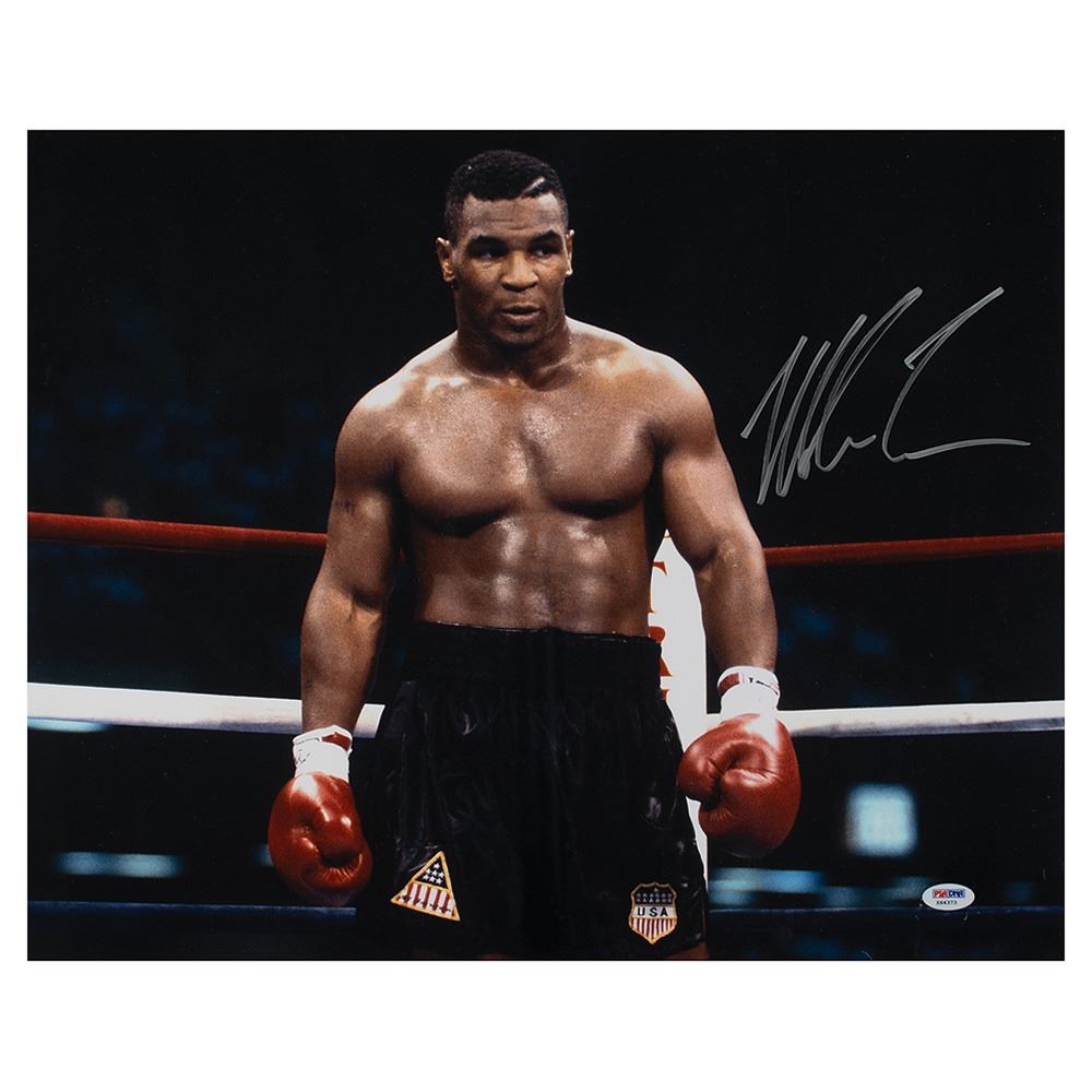 Color satin-finish 20 x 16 photo of Tyson looking intimidating in the ring, prominently signed in silver ink. In fine condition, with trivial rippling to top edge and a PSA/DNA label affixed to the lower corner. Accompanied by a certificate of authenticity from PSA/DNA.