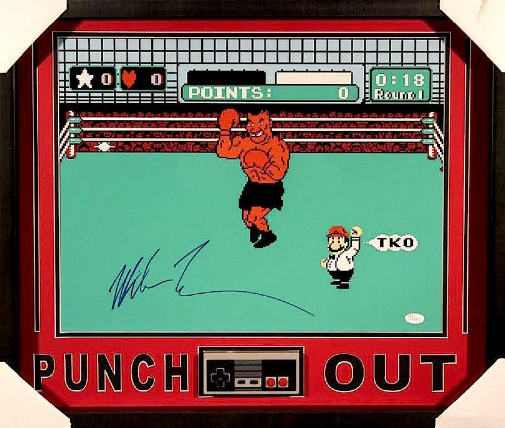 Custom frame measures 21" x 25" in size and features a photo that has been hand-signed in blue felt tip pen by Mike Tyson. The piece also included an original Nintendo Controller attached to the matting. The autograph includes an official James Spence Authentication (JSA) hologram and matching COA for authenticity purposes. The signing of this item was witnessed by JSA.