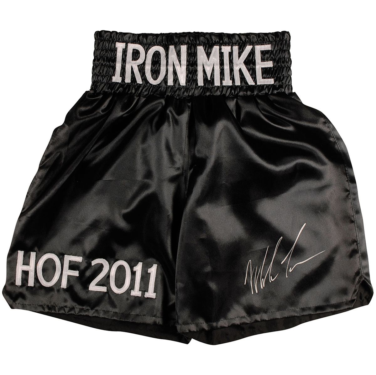 Black boxing trunks commemorating Tyson’s election to the Boxing Hall of Fame, signed in silver ink on the front. In fine condition. Accompanied by a certificate of authenticity from PSA/DNA.