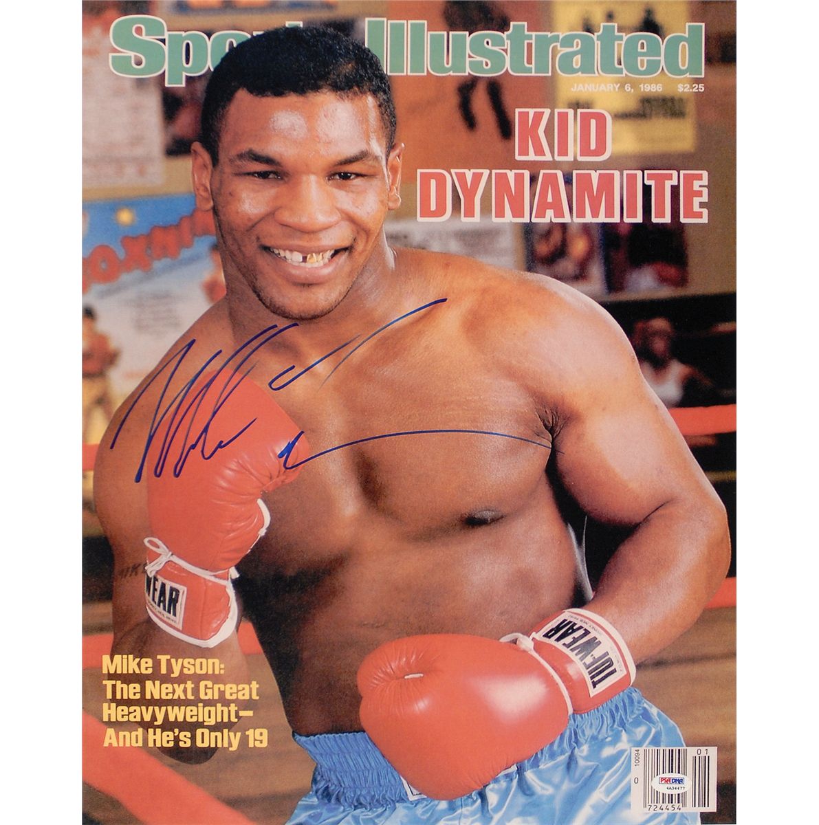 Color satin-finish 16 x 20 photo of Tyson’s ‘Kid Dynamite’ Sports Illustrated cover, signed in blue felt tip. In fine condition, with a PSA/DNA label affixed to the lower right corner.