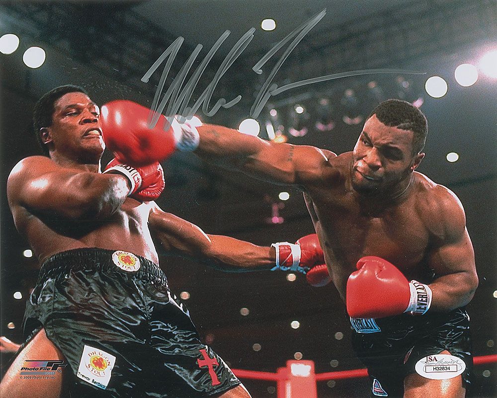 Color glossy 10 x 8 photo of Tyson in the ring with Trevor Berbick during his first heavyweight championship bout, signed in silver ink. In fine condition, with a James Spence authentication label affixed to lower corner. Accompanied by a certificate of authenticity from James Spence.