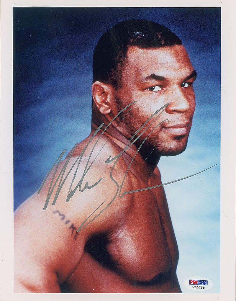 Color glossy 8 x 10 photo of Tyson in his prime, signed in silver ink. In fine condition, with a PSA/DNA authentication label affixed to lower corner. Accompanied by a certificate of authenticity from PSA/DNA.