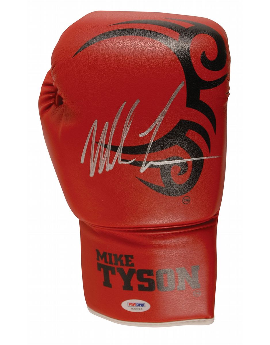 Red right-handed boxing glove inspired by Tyson’s facial tattoo, signed on the top in silver ink. In very fine condition, with a PSA/DNA label affixed to the wrist. Accompanied by a certificate of authenticity from PSA/DNA.