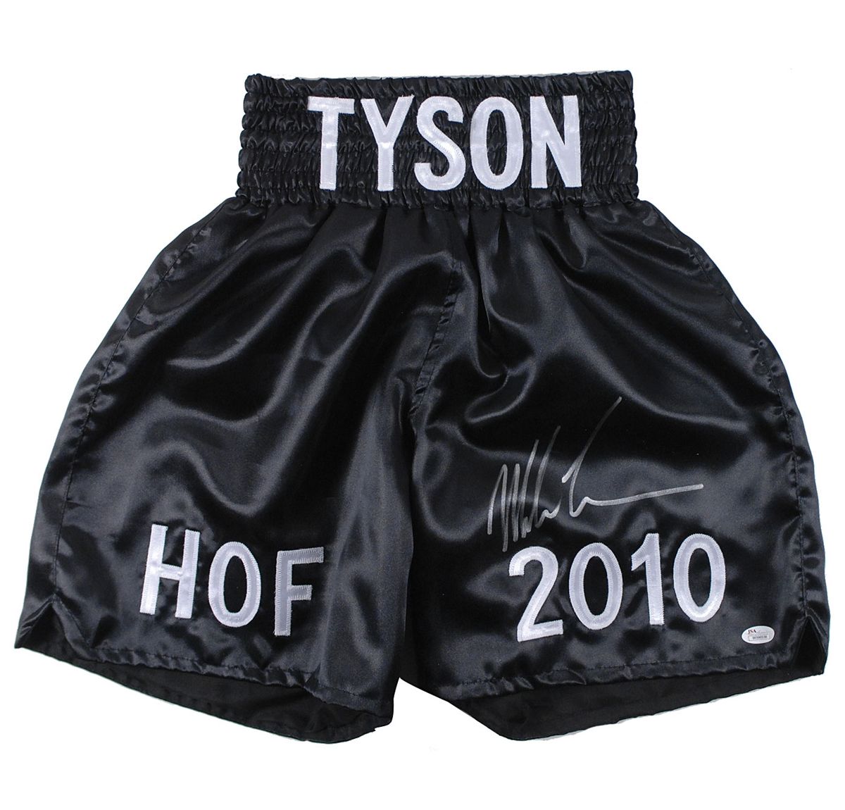 Black boxing trunks celebrating Tyson’s election to the Boxing Hall of Fame, signed in silver ink on the front. In fine condition, with a James Spence authentication label affixed to bottom. Accompanied by a photo taken at time of signing as well as a certificate of authenticity from James Spence.