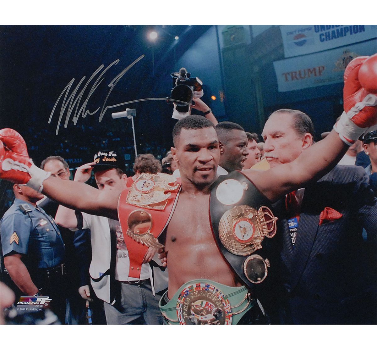 Color glossy 20 x 16 photo of Tyson draped in his title belts after his fight with Michael Spinks, signed in silver ink. Rolled and in fine condition.